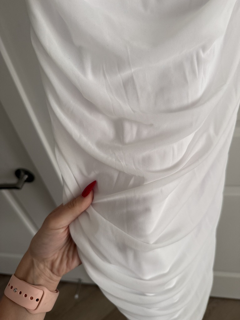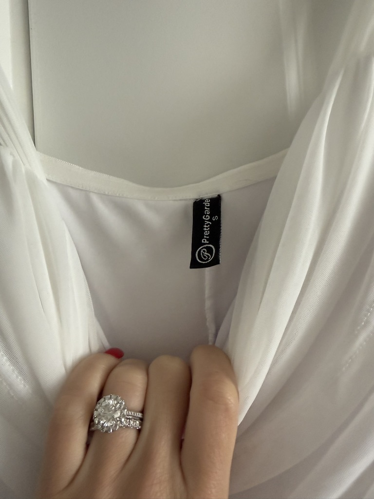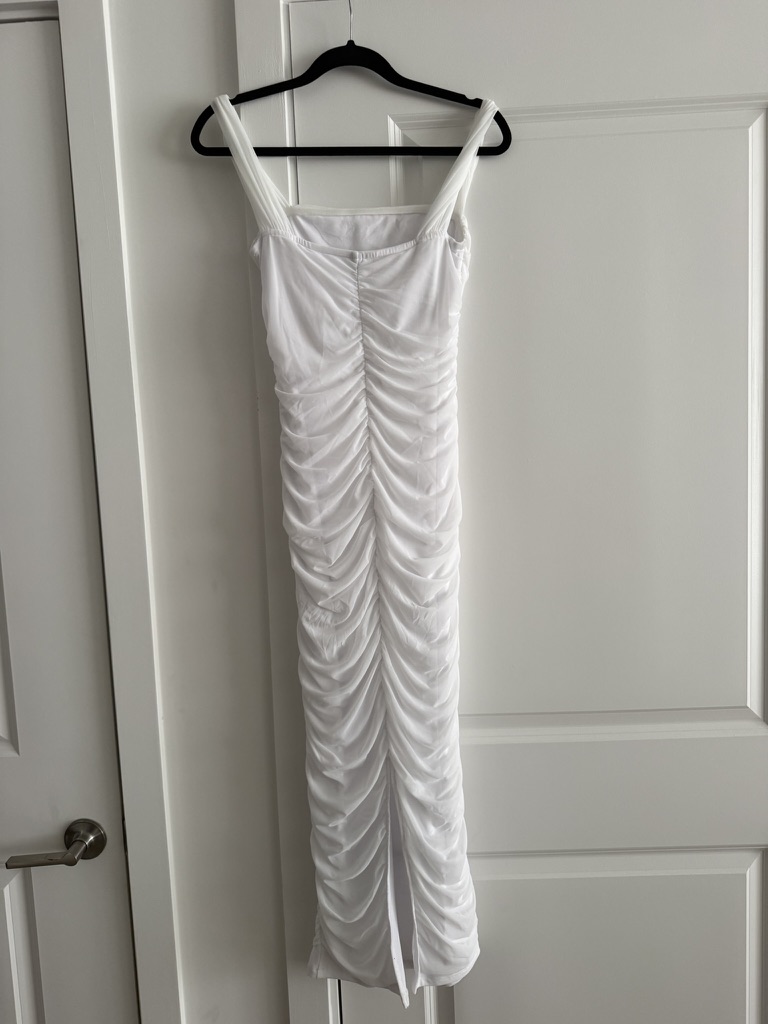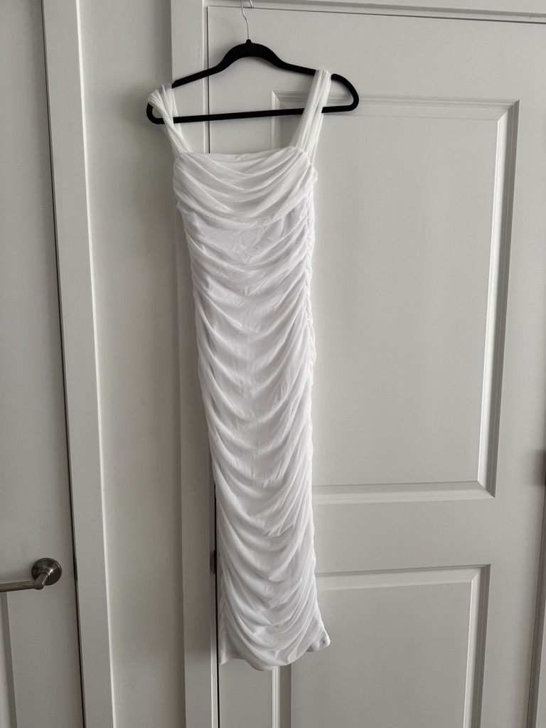 Size small amazon pretty garden Off The Shoulder Dress Ruched Bodycon Sleeveless Split – in the color white. Only been worn once, in GREAT condition. Worn for a rehearsal dinner!