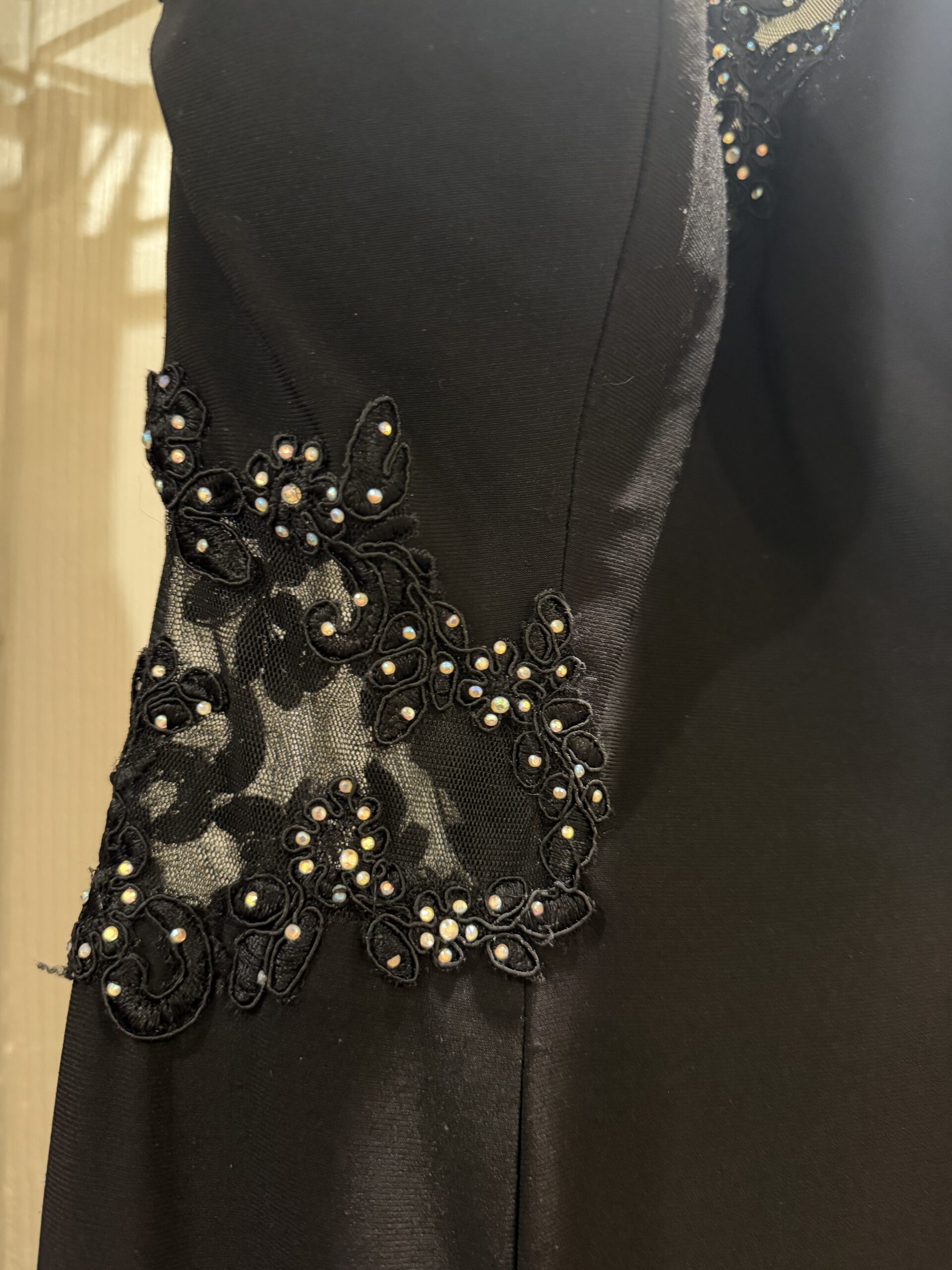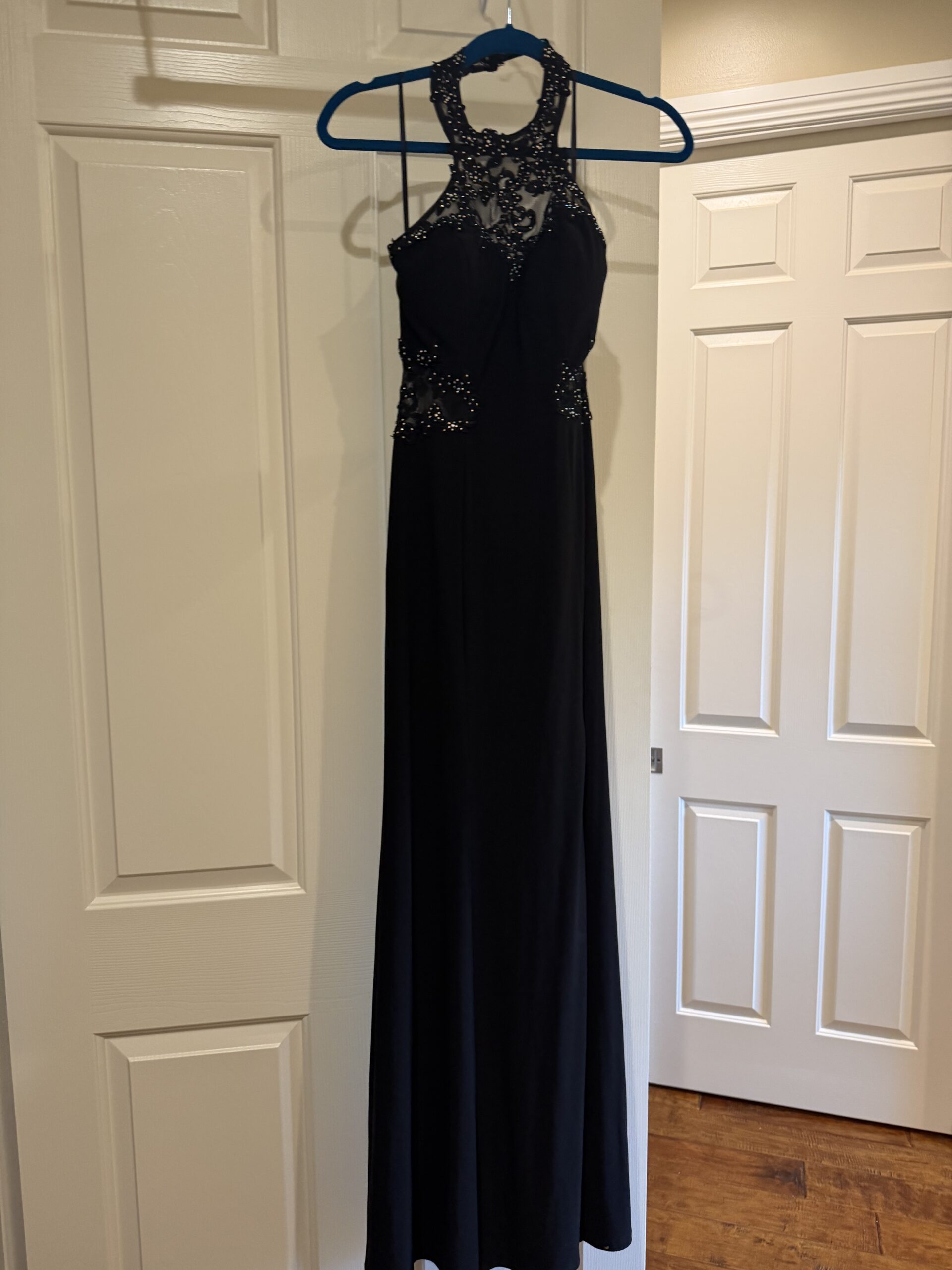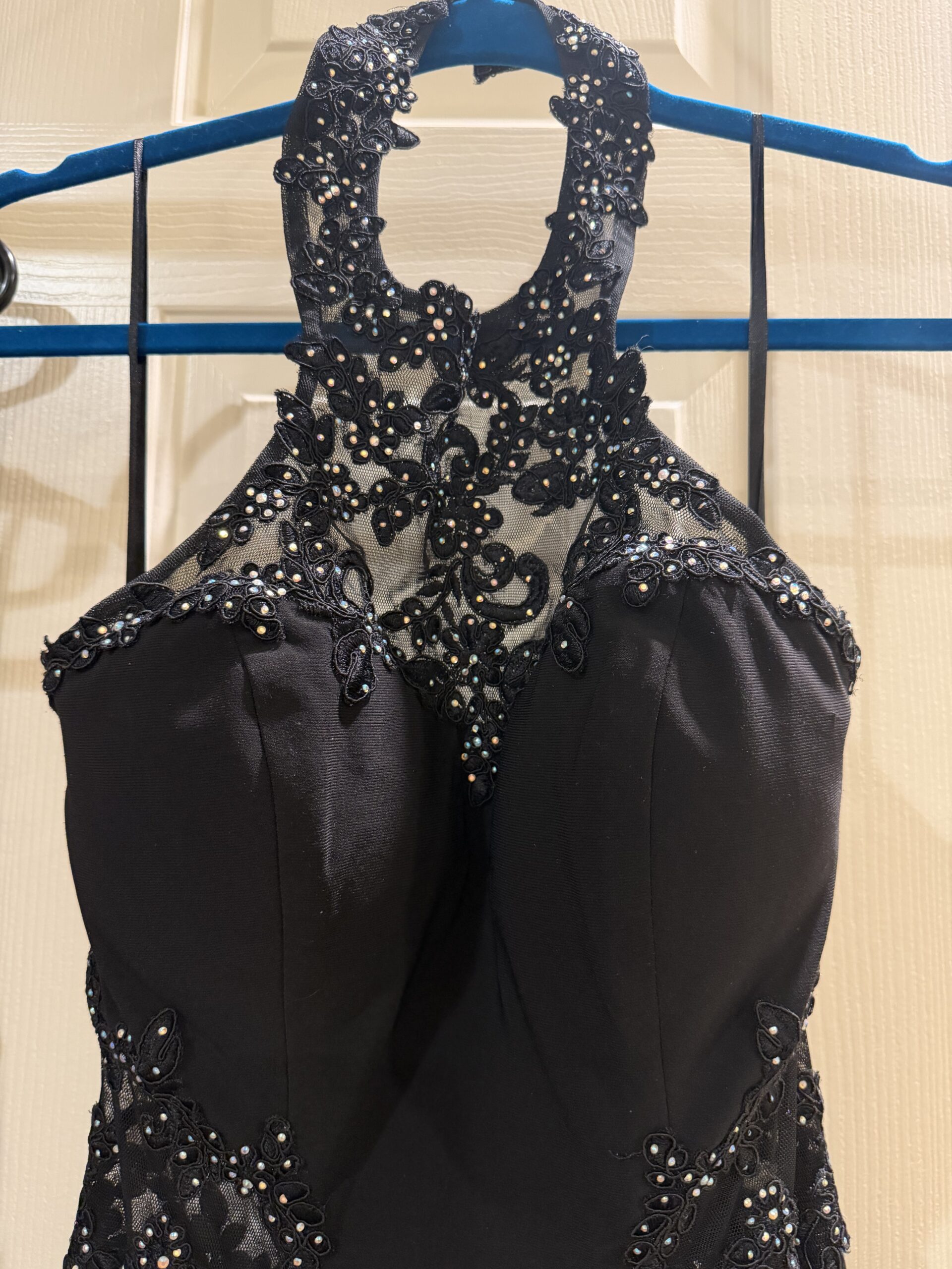 Black formal dress with lace illusion top and subtle embellishment. Classic and flattering style. Perfect for prom or evening events.