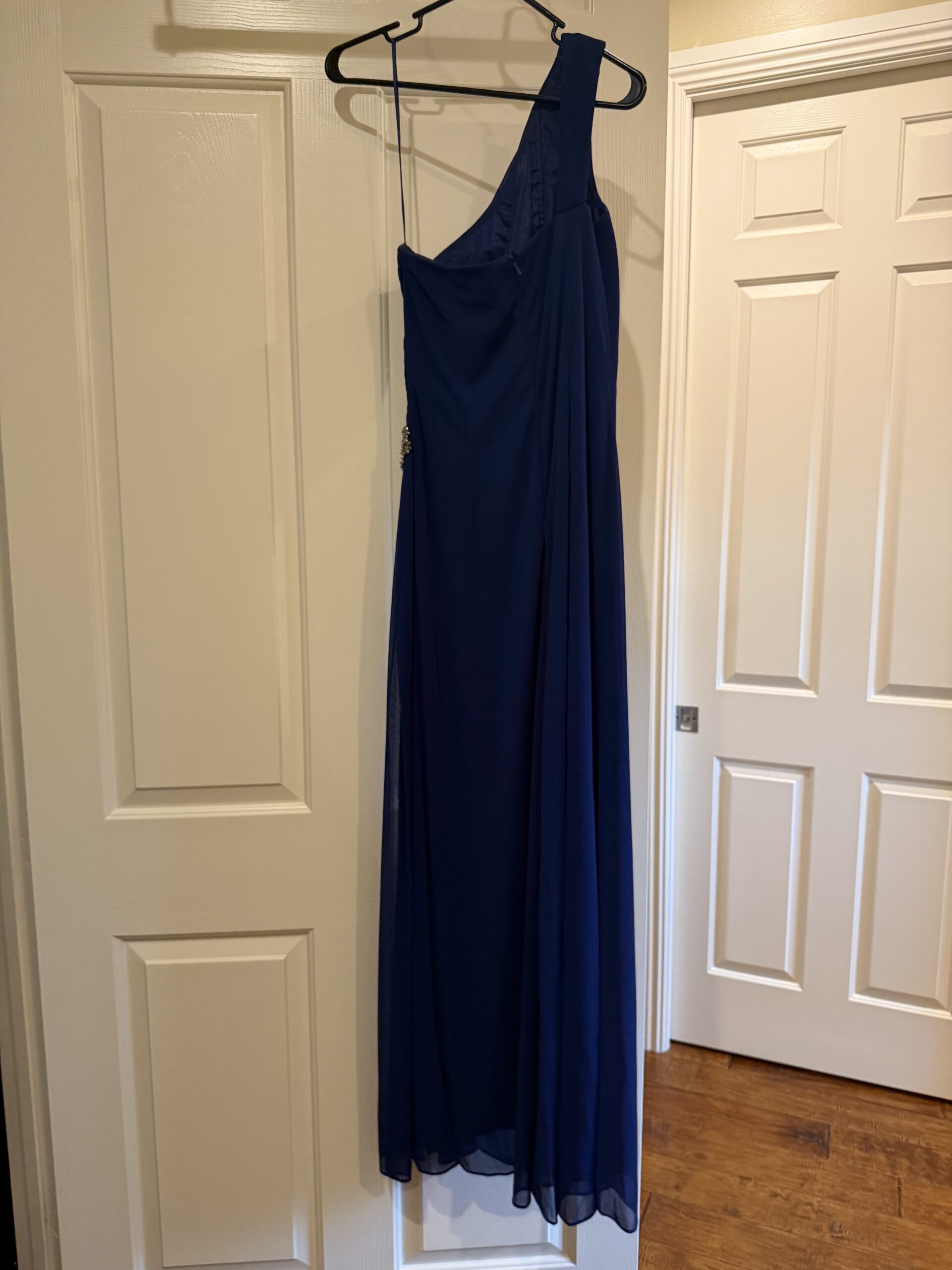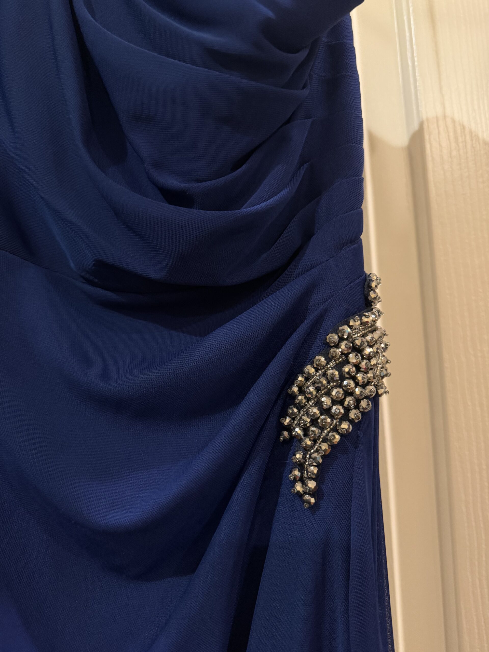 Beautiful royal blue one shoulder formal dress by LEX Evenings. Super flattering fit with ruching and subtle embellishment details.